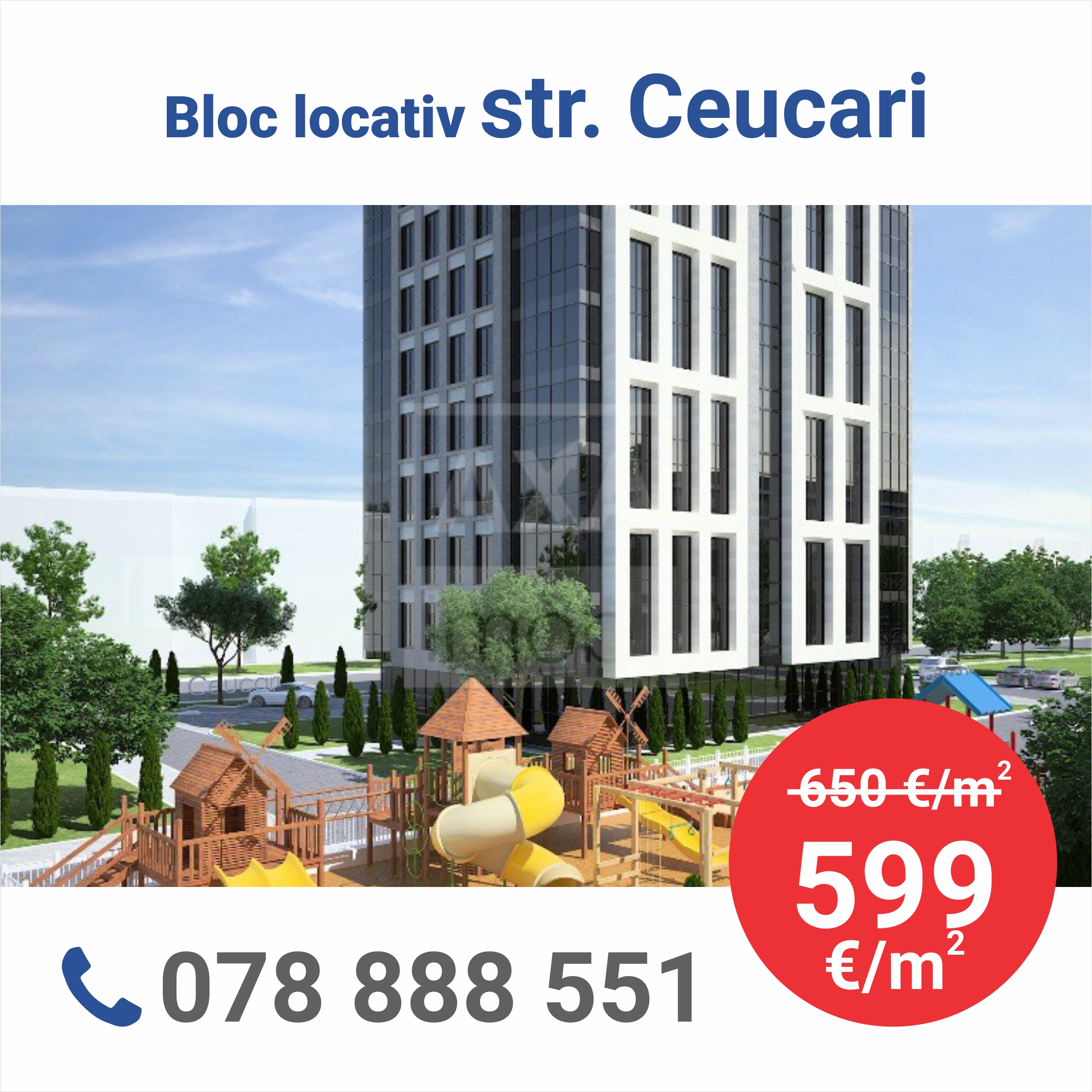 Blocul locativ amplasat pe str. Ceucari are 10 nivele, dispune de parcare subterană, precum şi loc de joacă pentru copii.
